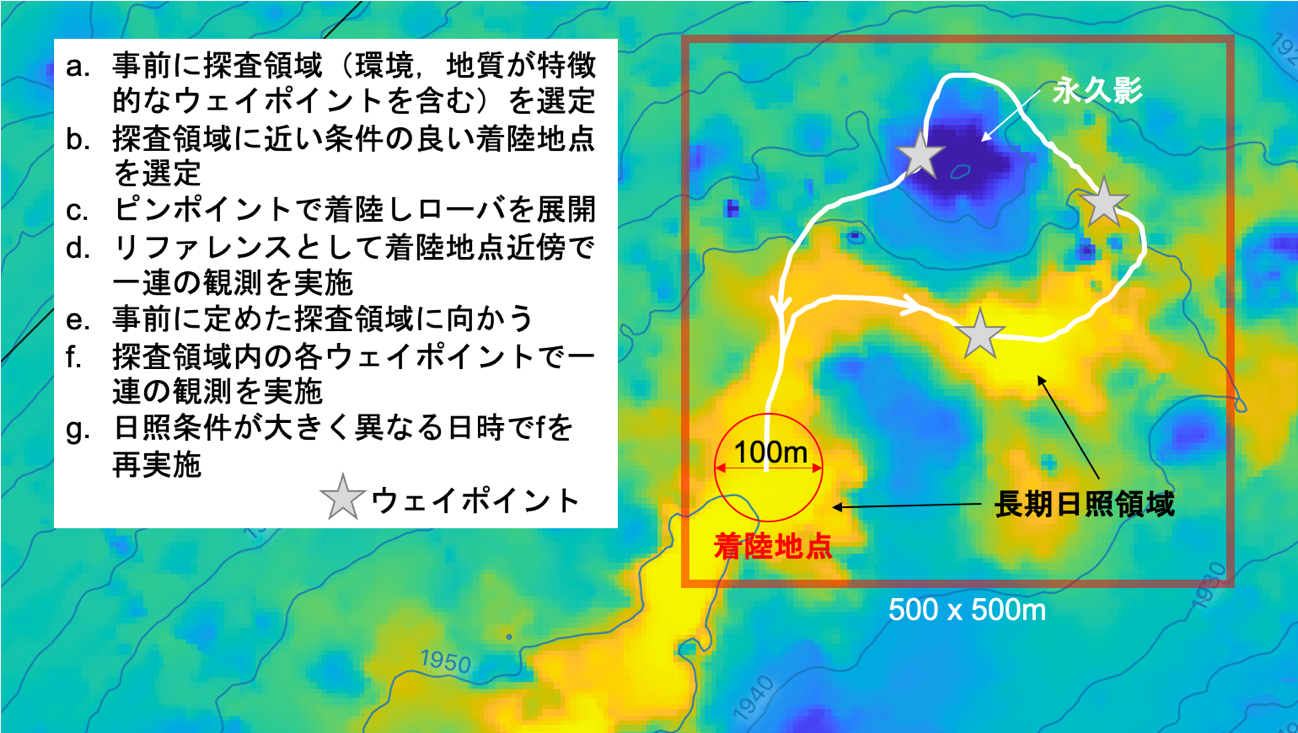 環境や地質が特徴的な探査領域と、観測地点(ウェイポイント)を事前に選定し、探査領域近くの⻑期⽇照地帯に着陸して、ローバを展開します。